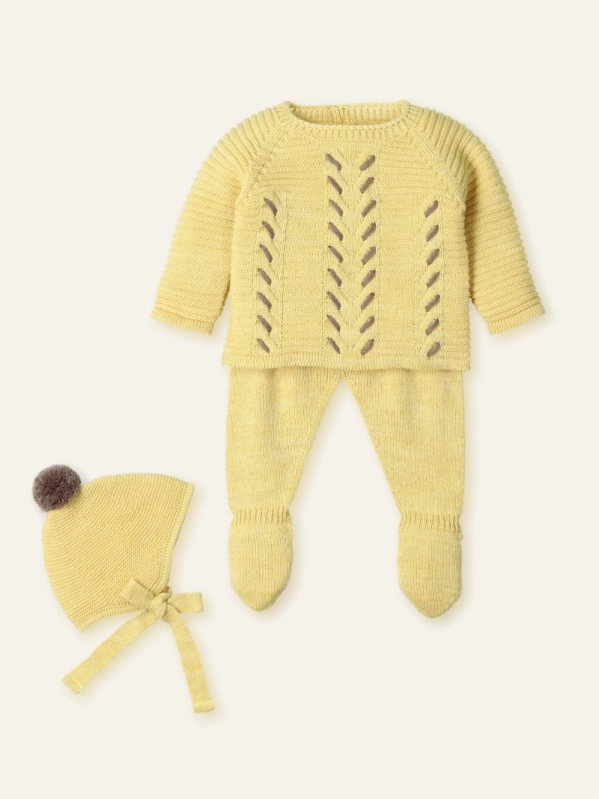 Traje 3 piezas con gorrito en tono mostaza, colección "Abetos Nectar" de Mac Ilusión
